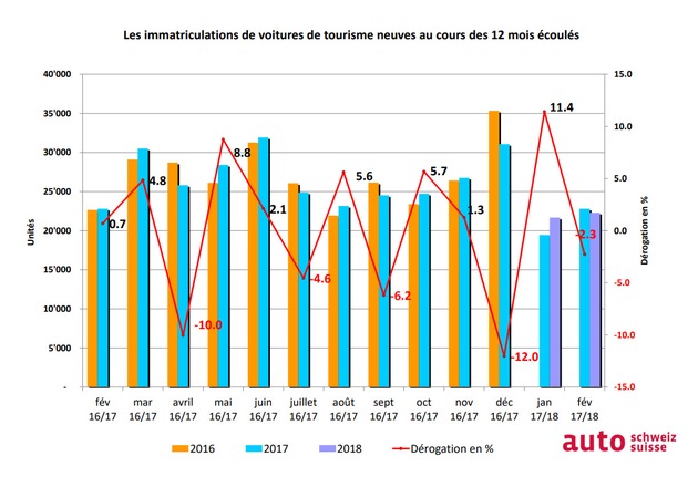 La branche automobile suisse peut appréhender en toute confiance l'ouverture officielle du 88ème Salon International de l'Automobile de Genève jeudi prochain. Les deux premiers mois de l'année montrent en effet un résultat cumulé pour la Suisse et la Principauté du Liechtenstein 4% supérieur à celui de la même période de l'année précédente. Après un fantastique janvier, février a été plus raisonnable avec un résultat à peine inférieur à celui de février 2017 avec 22'292 immatriculations, soit une perte de 2,3%. Ce ne sont donc pas moins de 43'963 véhicules neufs qui ont trouvé preneur pendant les deux premiers mois de l'année.
