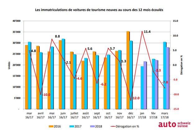 Le marché automobile en Suisse et dans la principauté du Lichtenstein comparable à celui de l'année précédente. Exactement 72'809 véhicules neufs ont été mis en circulation depuis le début de l'année. Cela correspond à une légère baisse de 680 immatriculations ou 0,9% par rapport à l'année précédente, ce qui s'explique en partie par les Fêtes de Pâques qui chevauchent la fin du trimestre, donnant au mois de mars 2 jours ouverts de moins et justifie donc une baisse de 7,8% par rapport à Mars 2017.