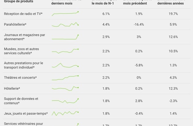 Les prix de la parahôtellerie ont également augmenté, de 4,4 %*. Ceux-ci incluent les logements de vacances ou les places de camping. Ils se hissent ainsi sur la deuxième marche du podium de l’inflation. Les prix des abonnements aux journaux et magazines (+2,9 %*) enregistrent la troisième plus forte augmentation.
