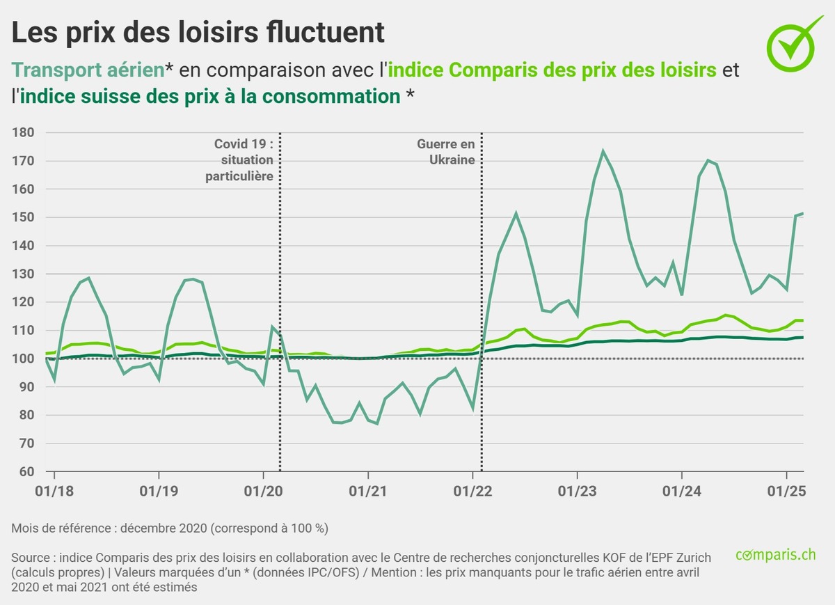 L’indice Comparis des prix des loisirs, établi en collaboration avec le Centre de recherches conjoncturelles (KOF) de l’EPFZ, reflète l’inflation à l’œuvre dans les domaines des loisirs et de la culture, de l’hôtellerie-restauration et des voyages exclusivement. Par ailleurs, Comparis tient explicitement compte de facteurs tels que le type de ménage, la catégorie de revenus et la région linguistique. Remarque importante : les chiffres marqués d’un (*) ont été calculés directement par l’Office fédéral de la statistique (IPC/OFS) ou reposent sur les chiffres de l’IPC/OFS.