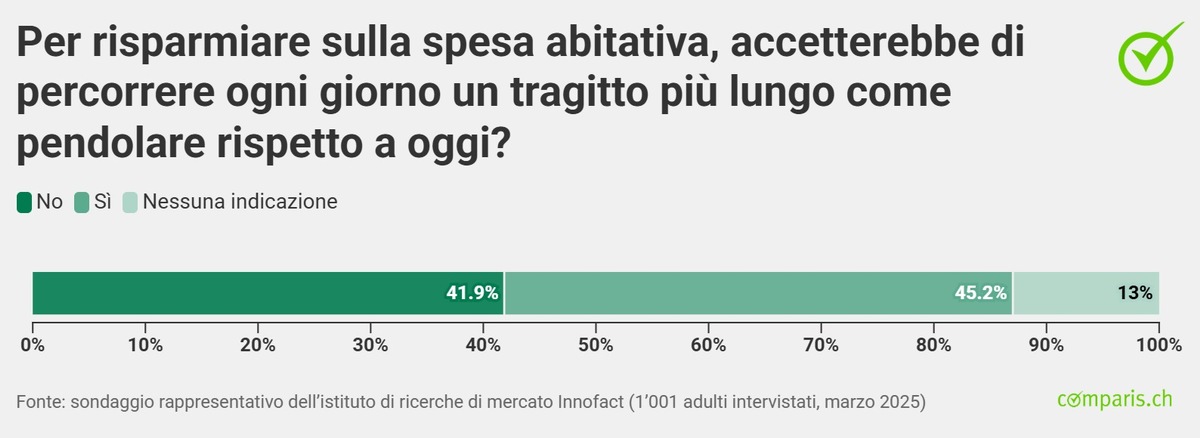 Allo stesso tempo, quasi la metà degli intervistati rifiuta categoricamente di allungare i tempi del tragitto casa-lavoro, anche se così si abbasserebbero notevolmente i costi dell’affitto. «Se ne deduce che c’è bisogno soprattutto di più progetti edili nelle città, dove lavora la maggior parte delle persone», afferma Büsser, esperto Comparis in immobili.