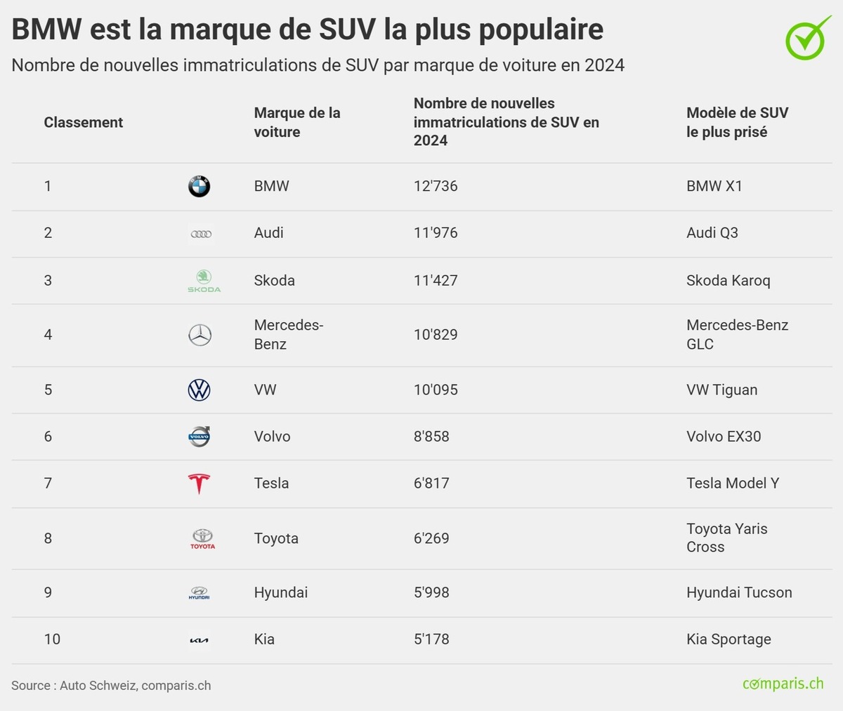 Ainsi, la marque principale de Volkswagen n’est pas non plus sur le podium cette année et n’occupe que la cinquième place (7,6 % de tous les SUV nouvellement immatriculés et 4,2 % de toutes les voitures neuves). Mercedes occupe la quatrième place avec sa série EQ et les classiques de la Classe G. Et ce, bien que les deux marques aient mis sur le marché le plus grand nombre de voitures neuves en Suisse (Volkswagen en première position avec 10 % de part de marché et Mercedes en quatrième position avec 8,5 % de part de marché).