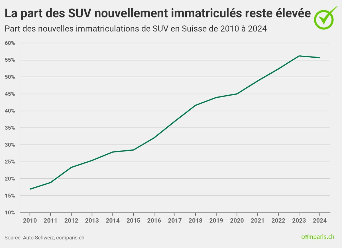 Zurich, le 27 mai 2025 – Les SUV (Sport Utility Vehicles) représentaient plus de la moitié de toutes les nouvelles immatriculations de véhicules en Suisse en 2024, soit 55,7 %. Tels sont les résultats du rapport SUV 2025. Celui-ci publie chaque année l’évolution de la part des SUV parmi toutes les nouvelles immatriculations en Suisse. Comparis inclut également dans les SUV les véhicules tout-terrain (p. ex. Toyota Landcruiser), les pick-up (p. ex. Ford Ranger) et les SUV crossover (p. ex. le Volkswagen T-Cross). La Suisse fait ainsi partie des leaders d’une tendance mondiale : selon les sources, la part des véhicules lifestyle robustes sur l’ensemble des voitures vendues en 2024 se situait entre 45 et 54 %.