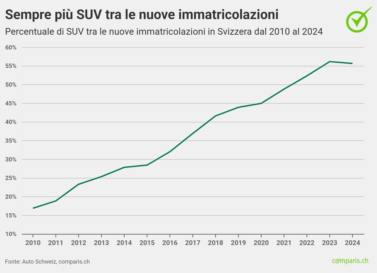 Comparis ha analizzato le immatricolazioni di auto nuove pubblicate da «Auto Schweiz» dal 2010. Dal momento che i SUV non rappresentano ufficialmente una classe di veicoli a sé stante, Comparis ha suddiviso le nuove immatricolazioni in SUV e non SUV. Sono stati presi in considerazione diversi criteri: i veicoli che dal 2015 in Germania sono catalogati come SUV o «fuoristrada» dal Kraftfahrt-Bundesamt (KBA) sono considerati SUV; i modelli catalogati come SUV nella lista Eurotax 3 mantengono la stessa classificazione; Comparis considera SUV anche «fuoristrada», «pick-up», «crossover» e «mini SUV», mentre non considera SUV i veicoli multiuso (MPV). La classificazione di Comparis non coincide necessariamente con le specifiche del produttore.