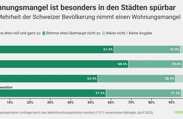 Zürich, 19. Juni 2025 – Der Wohnungsmangel in der Schweiz ist für viele spürbar: 61,4 Prozent der Bevölkerung finden, dass es in ihrer Region zu wenige Wohnungen gibt. Besonders ausgeprägt ist dieses Gefühl in der Westschweiz (65 Prozent), gefolgt von der Deutschschweiz (61 Prozent). Nur in der italienischsprachigen Schweiz ist kaum Wohnungsmangel spürbar. Nur 35 Prozent der Befragten bemerken dort einen solchen. Das zeigt eine repräsentative Befragung des Online-Vergleichsdienstes comparis.ch mit dem grössten Immobilienportal der Schweiz.