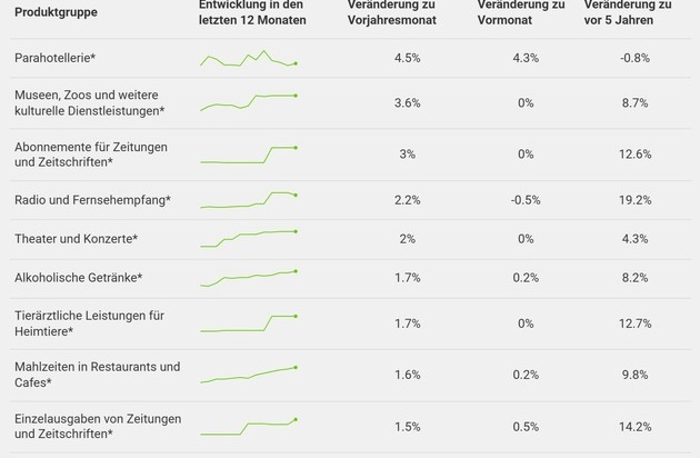 Gegenüber Vormonat am deutlichsten verteuert haben sich sonstige Dienstleistungen für Individualverkehr – dazu gehören unter anderem Park- und andere Gebühren – (plus 6,3 Prozent*), Fernseh- und Audio-/Videogeräte (plus 4,7 Prozent*), Pauschalreisen (plus 4,4 Prozent*), Parahotellerie (plus 4,3 Prozent*) sowie Hotellerie (plus 3 Prozent*). Im Fünfjahresvergleich zeigt sich, dass die Kosten für Pauschalreisen mit 30 Prozent und Hotellerie mit 21 Prozent massiv gestiegen sind.