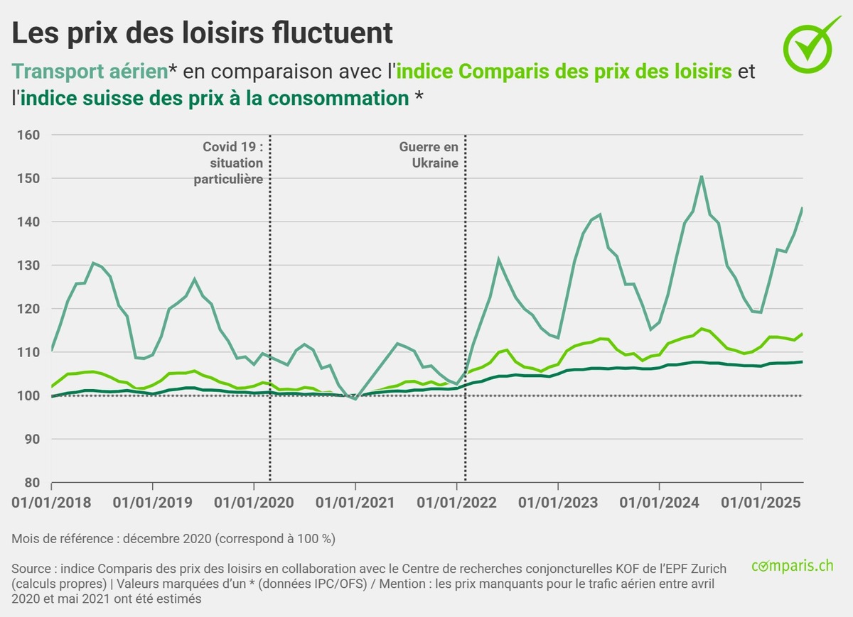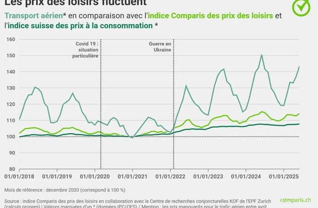 Zurich, le 29 juillet 2025 – En juin 2025, les prix des produits de loisirs en Suisse ont baissé de 0,9 % par rapport au même mois de l’année précédente. Tels sont les résultats de l’indice des prix des loisirs du comparateur en ligne comparis.ch, qui illustre l’évolution du renchérissement dans les domaines des loisirs et de la culture, ainsi que de la restauration et des voyages en Suisse. En comparaison, l’indice suisse des prix à la consommation (IPC) établi par l’Office fédéral de la statistique (OFS) rend compte d’un renchérissement annuel de 0,1 %*.