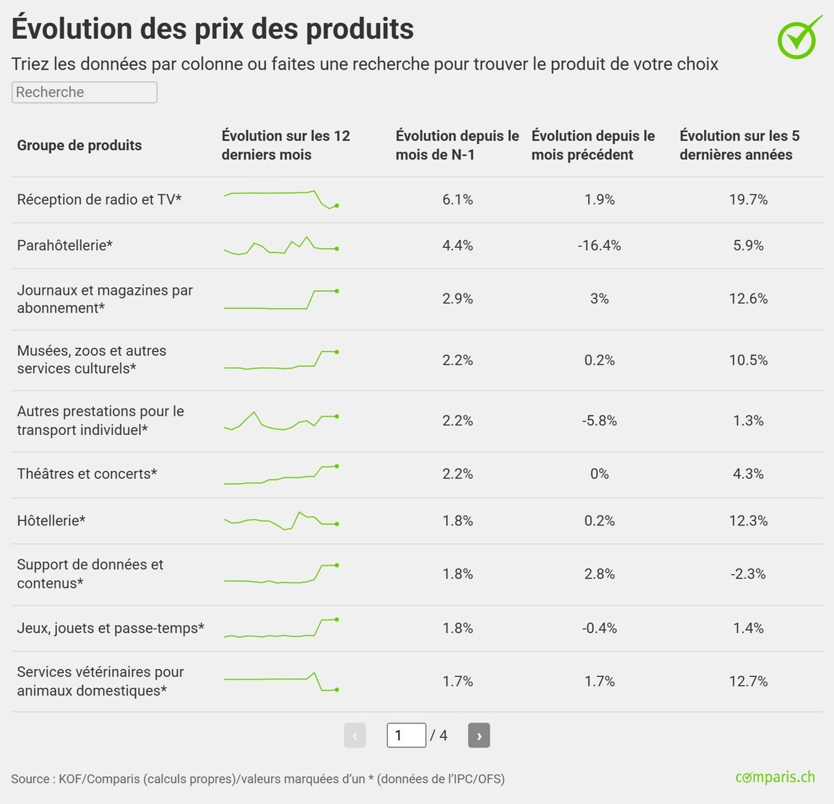 L’indice Comparis des prix des loisirs, établi en collaboration avec le Centre de recherches conjoncturelles (KOF) de l’EPFZ, reflète l’inflation à l’œuvre dans les domaines des loisirs et de la culture, de l’hôtellerie-restauration et des voyages exclusivement. Par ailleurs, Comparis tient explicitement compte de facteurs tels que le type de ménage, la catégorie de revenus et la région linguistique. Remarque importante : les chiffres marqués d’un (*) ont été calculés directement par l’Office fédéral de la statistique (IPC/OFS) ou reposent sur les chiffres de l’IPC/OFS.