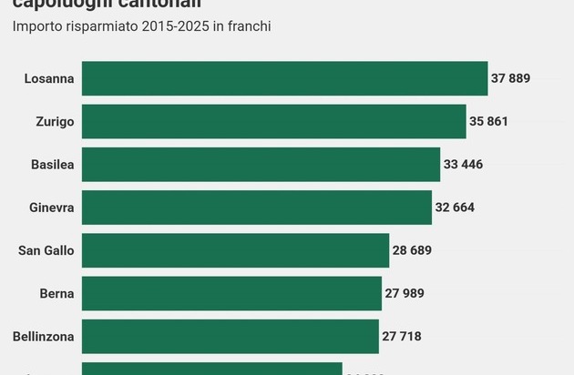 A Zurigo, passando da Concordia ad Assura, gli assicurati nel modello Medico di famiglia avrebbero speso 7’295 franchi (12,3%) in meno da gennaio 2015 a dicembre 2025. Nello stesso periodo, i bernesi avrebbero risparmiato 7’325 franchi (11,7%) passando da Concordia ad Assura, mentre gli assicurati di Basilea nel modello Medico di famiglia potrebbero aver risparmiato 7’375 franchi (11,1%) passando da Helsana ad Assura. A San Gallo il risparmio potenziale è di 5’117 franchi (9,8%) per chi è passato da Helsana ad Assura nel 2015. E a Losanna, passando ad Assura, gli assicurati di Visana hanno potuto spendere 10’112 franchi in meno (15,4%). I ticinesi risparmierebbero 9’164 franchi (14,1%) passando da Visana ad Assura.