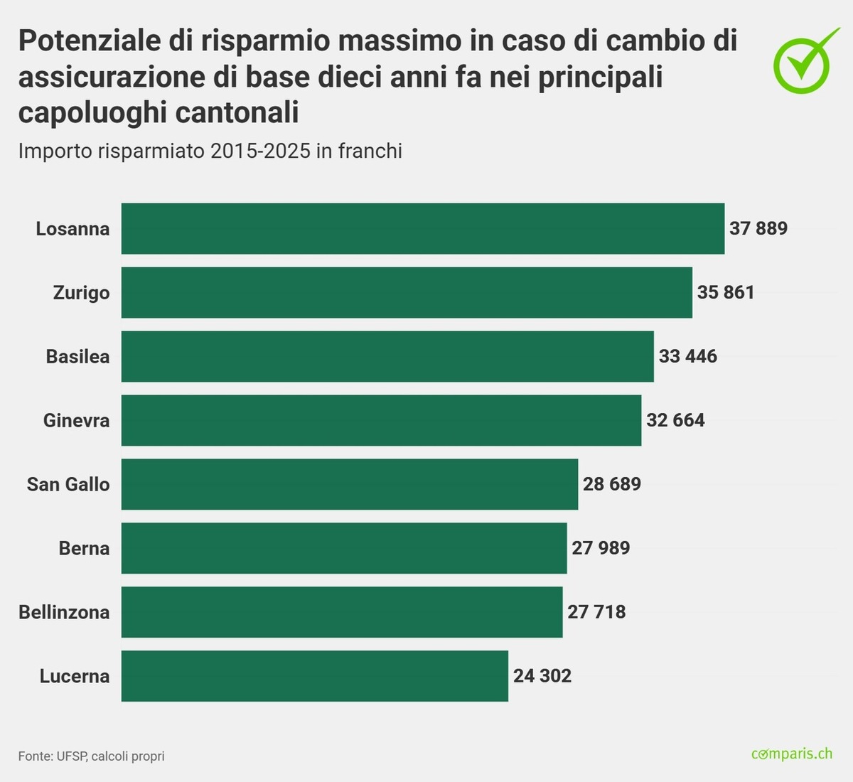 Passando dalla cassa più cara a quella più conveniente a gennaio 2015, anche senza cambi successivi si sarebbero potuti risparmiare entro la fine del 2025 35’861 franchi (49,7%) a Zurigo, 27’989 franchi (41,3%) a Berna, 24’302 franchi (43,6%) a Lucerna, 28’689 franchi (47,6%) a San Gallo, 27’718 franchi (40,7%) a Bellinzona, 32’664 franchi (43,5%) a Ginevra e 37’889 franchi (48,6%) a Losanna. A Basilea Città si avrebbero 33’446 franchi (43,6%) in più.