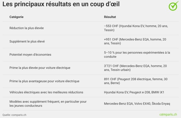 Pour l’analyse, Comparis a comparé sept véhicules électriques courants avec leurs équivalents à moteur thermique. Pour quatre profils de conducteurs typiques (âge, sexe) dans dix villes, les offres de casco complète de douze assureurs suisses ont été analysées.