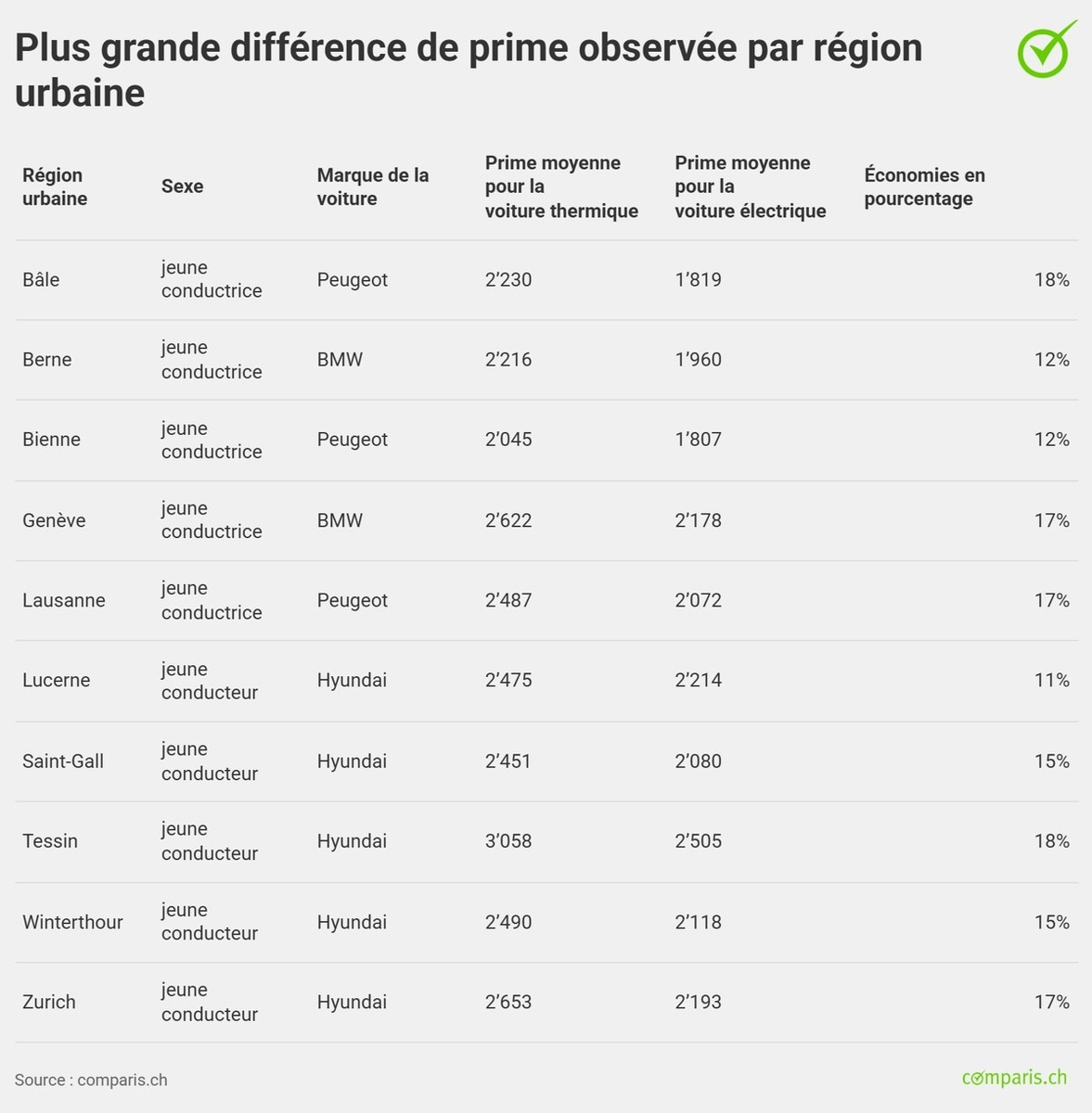 Pour les jeunes conductrices, la plus grande réduction sur les véhicules électriques est disponible à Bâle avec Peugeot. Elles peuvent y économiser environ 18 % sur leur prime. Les jeunes conductrices de la « Peugeot 208 électrique 100 kW Style » pour 26 490 francs paient une prime d’assurance moyenne de 1819 francs, tandis que la prime pour la « Peugeot 208 1.2 MHEV 100 Allure » pour 26 350 francs est en moyenne de 2230 francs.
