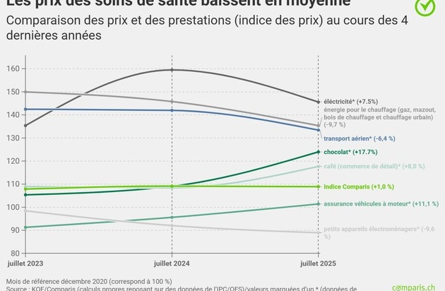 Zurich, le 26 août 2025 – L’indice Comparis des prix à la consommation, établi en collaboration avec le Centre de recherches conjoncturelles (KOF) de l’EPF Zurich, mesure l’inflation telle qu’elle est ressentie par les consommatrices et les consommateurs. Pour ce faire, seule l’évolution des prix des biens de consommation courante est prise en compte, par exemple ceux des denrées alimentaires, des médicaments ou des vêtements. Le taux d’inflation est ainsi calculé abstraction faite des loyers et des biens durables.