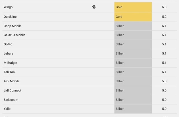 2025 hat erneut die Swisscom-Tochter Wingo die beste Bewertung für Handy-Abos und erhält somit das Gold-Siegel (Note: 5,3). Auf Platz 2 befindet sich Quickline (Note: 5,2), ebenfalls mit dem Gold-Siegel. Auf Platz 3 und in der Kategorie Silber reihen sich Coop Mobile, Galaxus Mobile, GoMo, Lebara, M-Budget Mobile und TalkTalk mit der Note 5,1 ein.