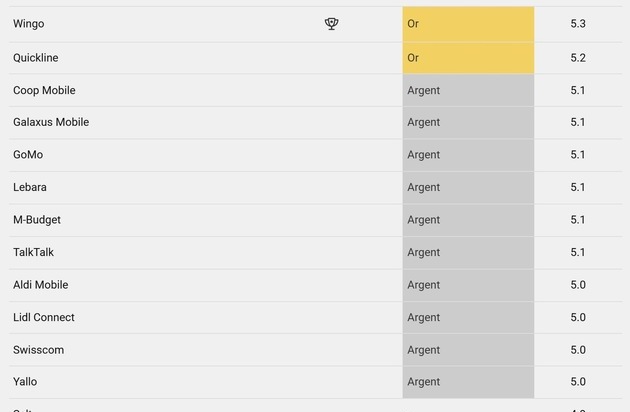 Entreprises victorieuses dans chacun des critères pris séparément : rapport qualité-prix : Wingo (5,4) ; qualité et service : Wingo (5,3) ; information et transparence : Wingo (5,1) ; points de contact et échanges : Wingo, Quickline, Coop Mobile, M-Budget Mobile, Swisscom (5,0) ; satisfaction globale : Wingo (5,4).