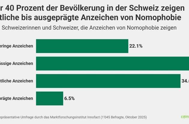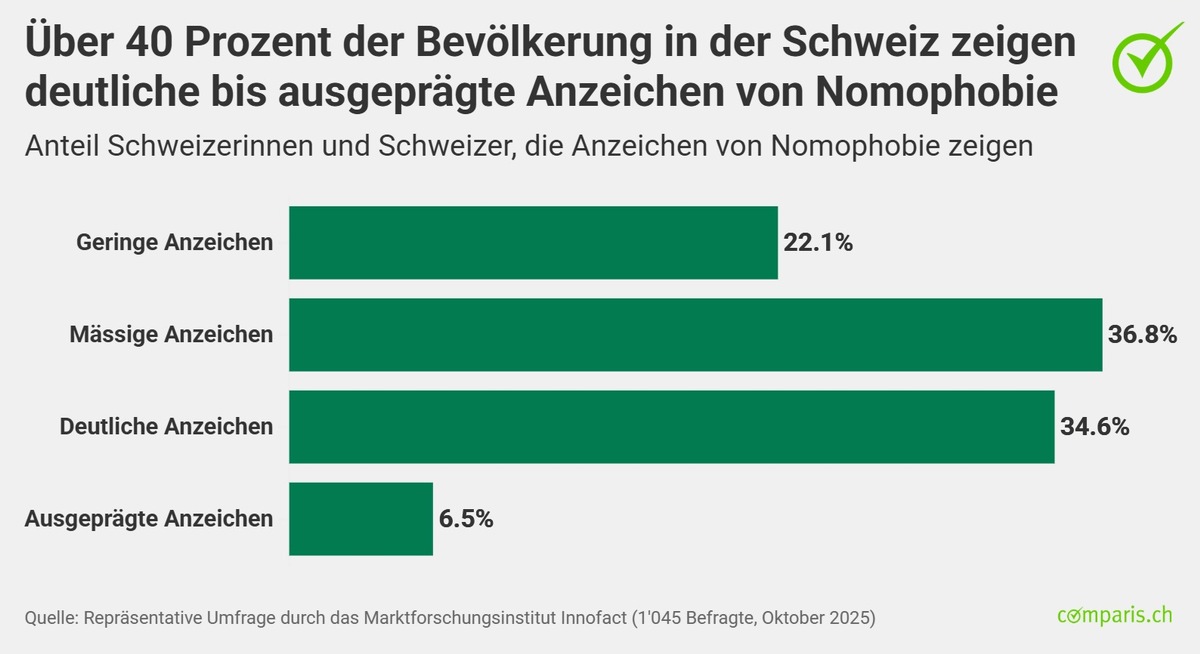 Zürich, 4. Dezember 2025 – «Nomophobie», also die Angst, ohne Mobiltelefon zu sein, zeigt sich unterschiedlich stark in der Bevölkerung. Eine Umfrage des Online-Vergleichsdienstes comparis.ch analysiert 4 Kategorien von Anzeichen: gering, mässig, deutlich und ausgeprägt. Die Abhängigkeit vom Mobilfunkgerät in der Schweiz ist erschreckend hoch. Die Umfrage wurde 2025 zum zweiten Mal durchgeführt.