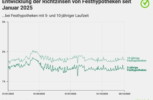 Zürich, 9. Dezember 2025 – Die von über 30 Kreditinstituten öffentlich publizierten Referenzzinsen (sogenannte Richtzinsen) für zehnjährige Festhypotheken liegen derzeit bei 1,74 Prozent (Stand 5. Dezember) und damit 0,11 Prozentpunkte über dem Niveau zu Jahresbeginn (1,63 Prozent). Die Zinssätze für Festhypotheken haben sich somit nach den starken Schwankungen im ersten Halbjahr in den letzten Monaten deutlich beruhigt. Lagen im März die Richtzinsen für 10-jährige Festhypotheken noch bei knapp über 2 Prozent, bewegen sie sich seit Ende Juni in einer Spanne von 1,64 bis 1,87 Prozent.