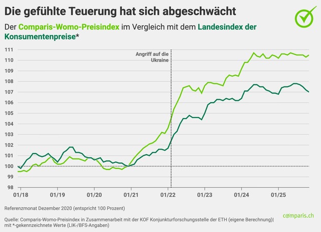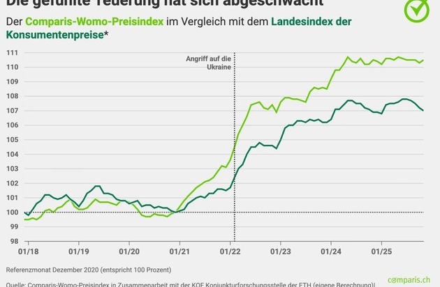 Zürich, 18. Dezember 2025 – Seit März 2024 erscheint der Comparis-Womo-Preisindex vierteljährlich in Zusammenarbeit mit dem KOF-Institut der ETH Zürich. Er zeigt auf, wie sich die Teuerung in den Bereichen Wohnen und Mobilität (Womo) entwickelt hat.