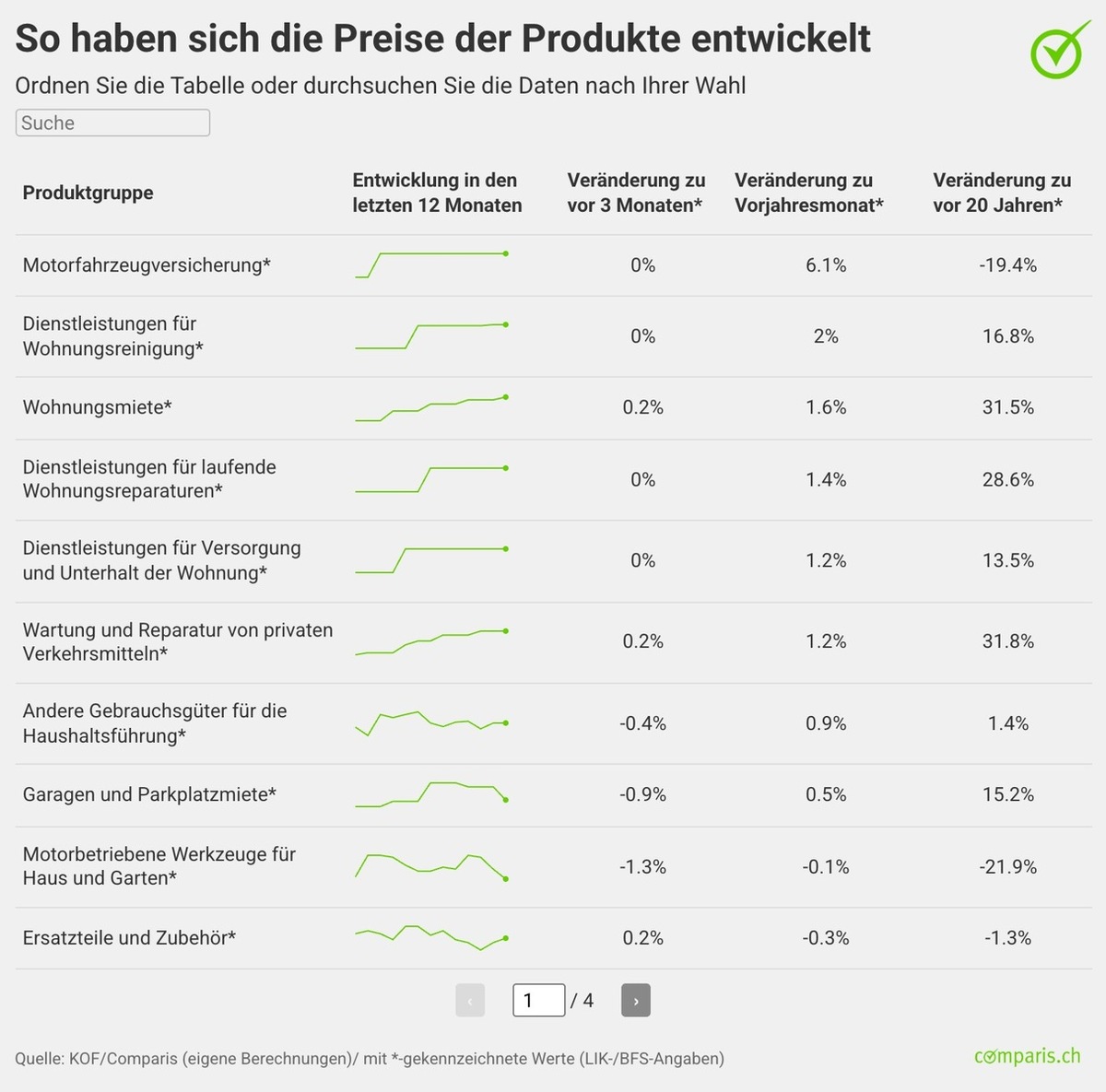 Der Comparis-Womo-Preisindex in Zusammenarbeit mit dem KOF-Institut der ETH-Zürich bildet die Inflation ausschliesslich in den Bereichen Wohnen und Mobilität ab. Zudem werden explizit einzelne Haushaltsgruppen, Einkommensklassen und Sprachregionen berücksichtigt. Weiter wird ein geglätteter 20-Jahres-Preisvergleich berechnet sowie eigene Berechnungen für vereinzelte Produktgruppen angestellt. Wichtiger Hinweis: Mit einem (*) gekennzeichnete Zahlen wurden vom Bundesamt für Statistik (LIK/BFS) direkt berechnet respektive beruhen auf den Zahlen des LIK/BFS.