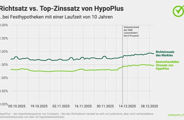Bei den von Comparis berechneten Richtsätzen handelt es sich um publizierte, aber noch verhandelbare Durchschnittszinsen von über 30 Hypothekarinstituten. Die von HypoPlus tatsächlich ausgehandelten Zinssätze liegen deutlich tiefer: Der beste ausgehandelte Zins für eine zehnjährige Festhypothek lag am 31. Dezember 2025 bei 1,48 Prozent. Der Richtsatz lag zum selben Zeitpunkt bei 1,91 Prozent.