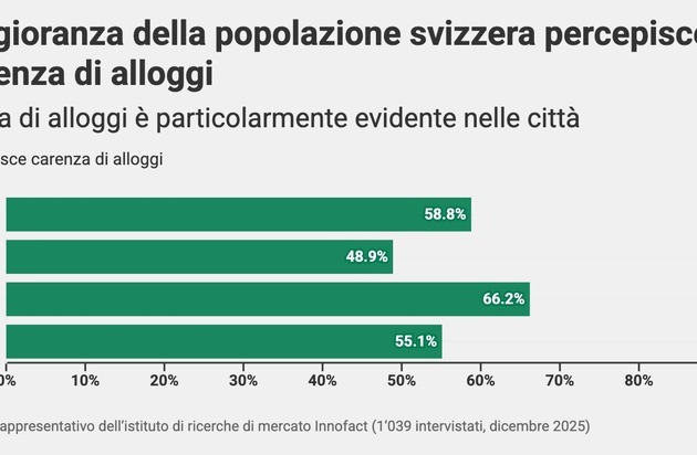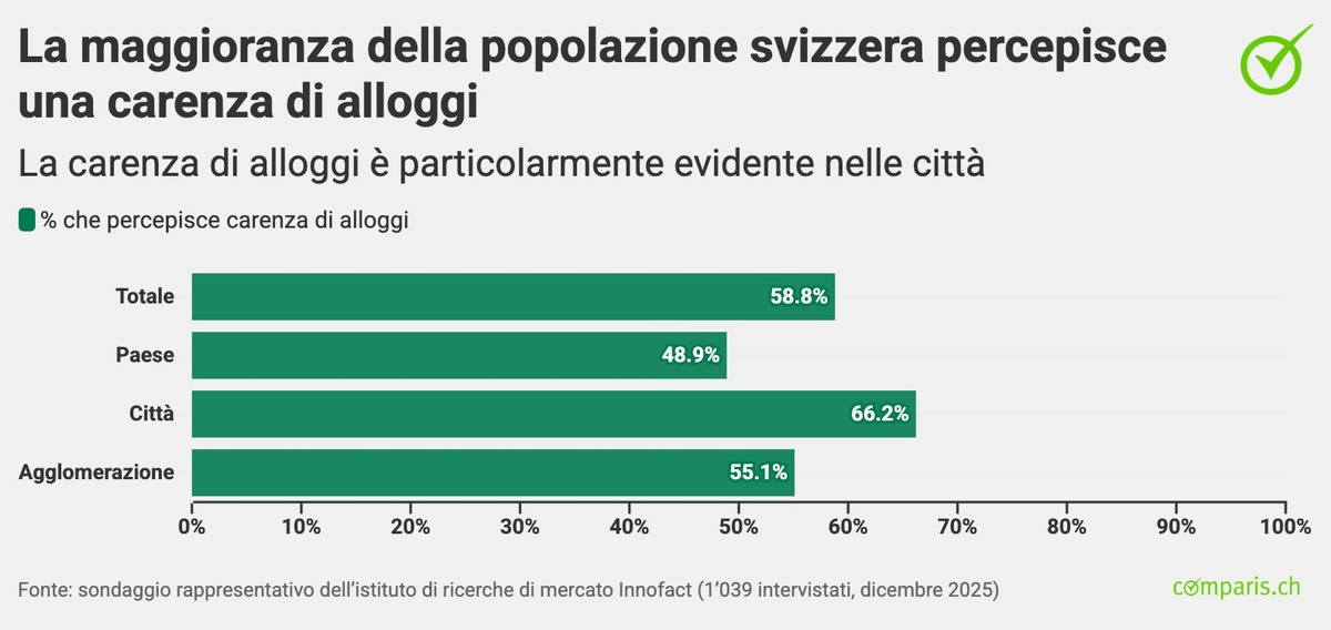 Zurigo, 27 gennaio 2026 – La carenza di alloggi in Svizzera rimane una tematica predominante della vita quotidiana. Il 59% della popolazione adulta percepisce una carenza di alloggi disponibili nella propria regione, nelle città la percentuale è addirittura del 66%. È quanto emerge da un sondaggio rappresentativo di comparis.ch, che gestisce il più grande portale immobiliare della Svizzera.