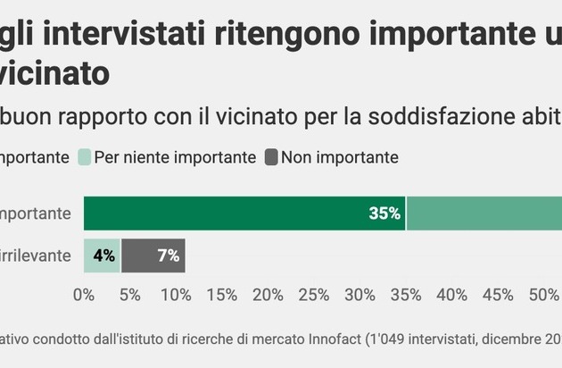 Per tre quarti degli over 55 è importante avere un buon rapporto con il vicinato. Si tratta di una percentuale significativamente più alta rispetto agli intervistati più giovani (68% dei 36-55enni e 55% degli under 36). L’argomento è anche molto più importante nella Svizzera romanda (76%) che nella Svizzera tedesca (63%) e nelle famiglie con bambini (71% rispetto al 64% senza bambini).