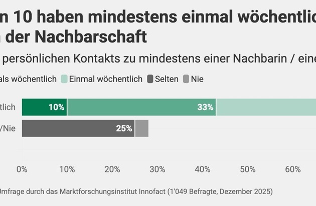 Zürich, 26. Februar 2026 – In einem dicht besiedelten Land wie der Schweiz ist Nachbarschaft kein Nebenschauplatz – sie gehört zum Alltag. Und sie ist entscheidend dafür, wie zufrieden Menschen mit ihrem Zuhause sind. Das zeigt eine repräsentative Umfrage des Internet-Vergleichsdienstes Comparis mit dem grössten Immobilienportal der Schweiz. 66 Prozent der Befragten geben an, ein guter Nachbarschaftskontakt sei wichtig bis sehr wichtig für die eigene Wohnzufriedenheit. «Wir reden ständig über Mietpreise. Aber ein schlechtes Verhältnis im Treppenhaus kann jede Traumwohnung entwerten», sagt Comparis-Immobilienexperte Harry Büsser. «Miete, Lage, Ausstattung – alles wichtig. Aber ob man sich zu Hause fühlt, entscheidet oft der Mensch nebenan», sagt Büsser.