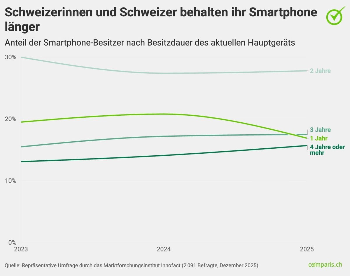 Die Zahlen zeigen, dass die längere Nutzungsdauer nicht nur ein Wunsch bleibt, sondern auch in die Tat umgesetzt wird: Immer mehr Personen behalten ihr Smartphone über längere Zeiträume. 2025 gaben bereits 15,7 Prozent der Befragten an, ihr Hauptgerät seit 4 Jahren oder länger zu besitzen. Diese Zahl stellt den höchsten Wert der letzten 5 Jahre dar. 2023 besassen 13,1 Prozent der Teilnehmenden ihr Smartphone seit mindestens 4 Jahren. 2020 war der Anteil mit 8,9 Prozent der niedrigste.