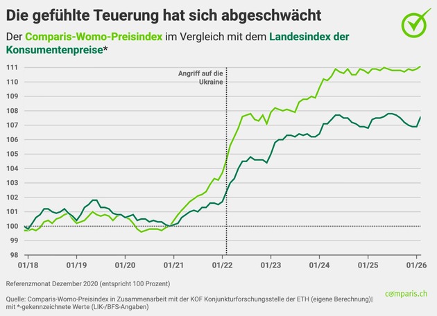 Zürich, 26. März 2026 – Seit März 2024 erscheint der Comparis-Womo-Preisindex vierteljährlich in Zusammenarbeit mit dem KOF-Institut der ETH Zürich. Er zeigt, wie sich die Teuerung in den Bereichen Wohnen und Mobilität entwickelt hat.
