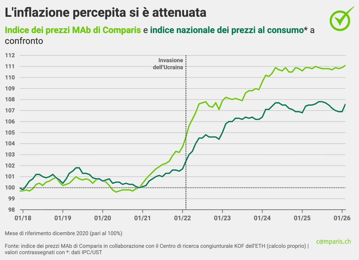 Zurigo, 26 marzo 2026 – Da marzo 2024, l’indice dei prezzi MAb di Comparis viene pubblicato su base trimestrale in collaborazione con il Centro di ricerca congiunturale (KOF Institute) del Politecnico federale di Zurigo (ETH). Il rapporto mostra l’andamento dei rincari nei settori abitazione e mobilità (MAb).
