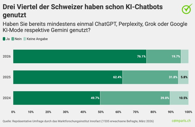 Zürich, 02. April 2026 – Künstliche Intelligenz (KI) ist endgültig im Alltag der Schweizer Bevölkerung angekommen. Der Anteil der Personen, die KI-Chatbots wie ChatGPT, Google Gemini, Perplexity und andere nutzen, ist rasant gestiegen. Im Jahr 2024 lag dieser Anteil bei 49,7 Prozent, im Jahr 2025 stieg er auf 62,4 Prozent und erreichte 2026 sogar 76,1 Prozent. Das zeigt eine repräsentative Umfrage des Internet-Vergleichsdienstes Comparis. «Die Nutzung von KI-Tools wird immer selbstverständlicher. Durch KI-Funktionen in der Google-Suche kommt heute praktisch jede Internetnutzerin und jeder Internetnutzer automatisch mit künstlicher Intelligenz in Kontakt», sagt Comparis-Digitalexperte Jean-Claude Frick.