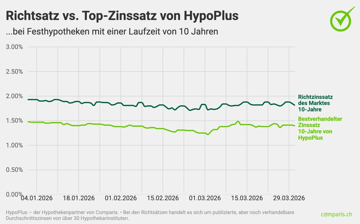 Bei den von Comparis berechneten Richtsätzen handelt es sich um publizierte, aber noch verhandelbare Durchschnittszinsen von über 30 Hypothekarinstituten. Die von HypoPlus tatsächlich ausgehandelten Zinssätze liegen deutlich tiefer: Der beste ausgehandelte Zins für eine 10-jährige Festhypothek lag am 31. März 2026 bei 1,39 Prozent. Der Richtsatz lag zum selben Zeitpunkt bei 1,81 Prozent.