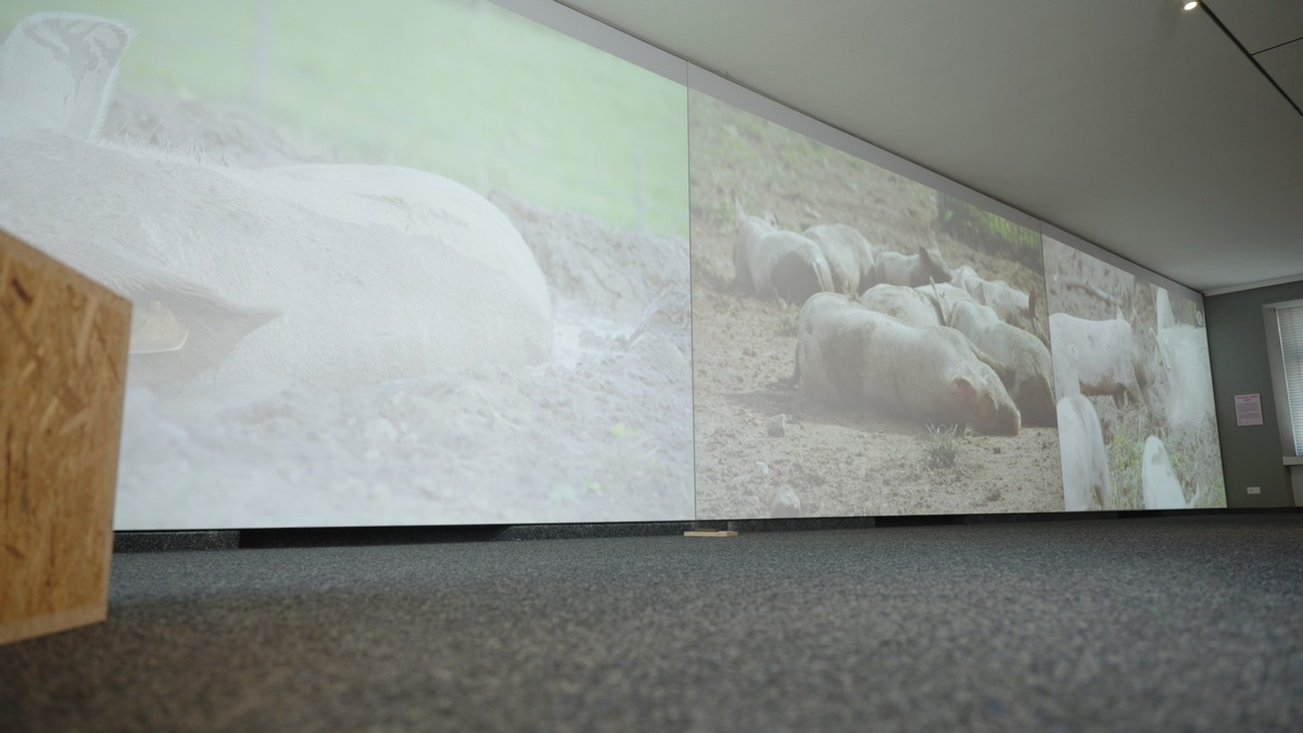 «Wir sind in der Ausstellung praktisch Teil des Schweinelebens. Wir haben die Schweine überdimensional vergrössert, damit die Besuchenden richtig eintauchen können und direkt auf Augenhöhe mit den Tieren stehen. Ich habe mich auch selbst direkt vor die Leinwände gestellt und es ist wirklich ein sehr spezielles Erlebnis. Man blickt den Tieren sozusagen in die Augen.»
