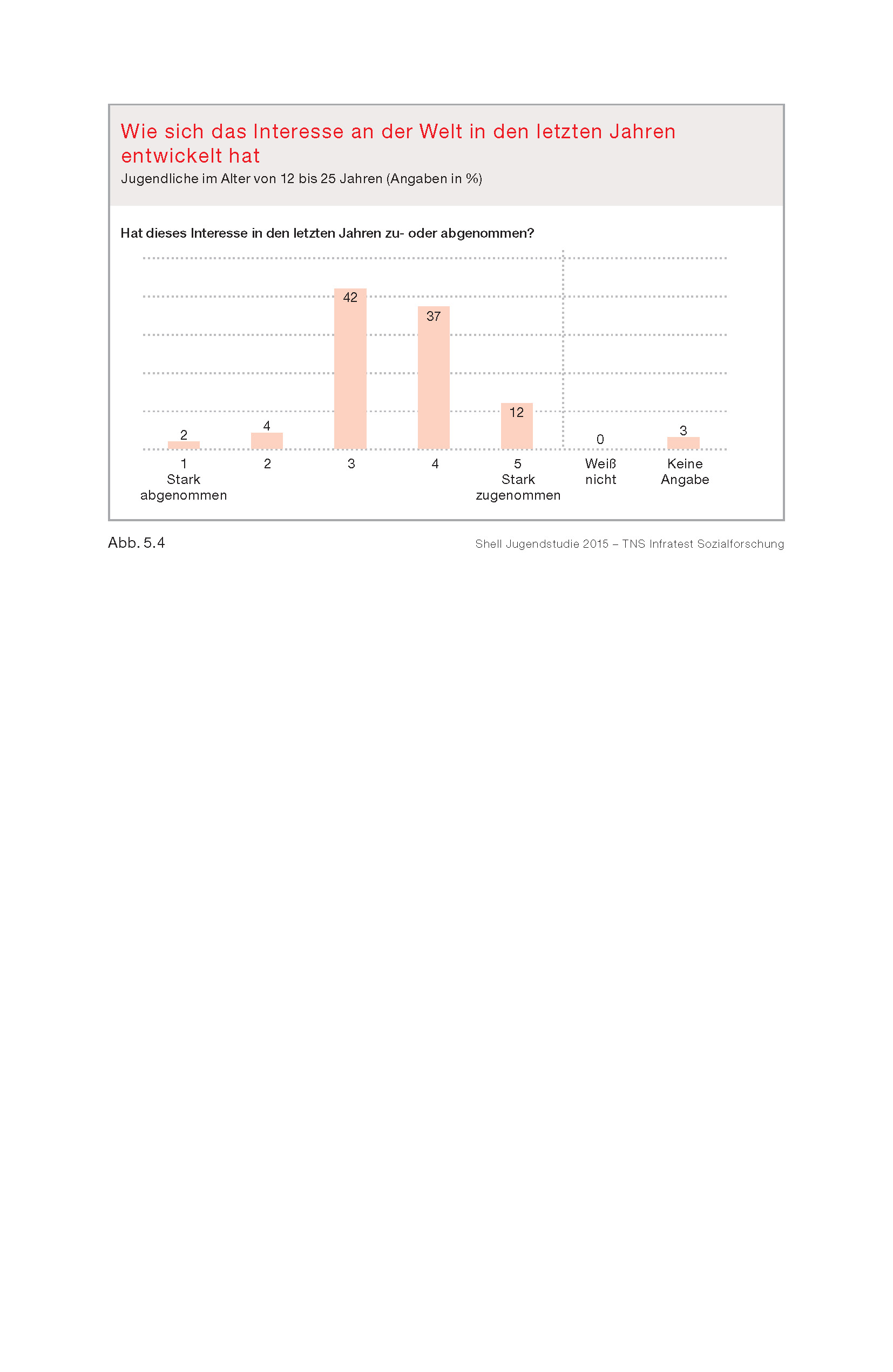 Jugendliche interessieren sich zunehmend für das Weltgeschehen, das ihnen allerdings auch Sorgen macht. Die gestiegene Terrorgefahr und der Konflikt in der Ukraine sind im Bewusstsein der Jugendlichen stark präsent. Fürchteten sich 2010 nur 44 Prozent vor Krieg in Europa, ist die Zahl 2015 sprunghaft auf 62 Prozent angestiegen. Das sind etwas mehr als 2002, als die Kriege im früheren Jugoslawien nachwirkten. Drei Viertel haben Angst vor Terroranschlägen. Für Deutschland wünschen sich die Jugendlichen in der internationalen Politik eine wichtige, vermittelnde, aber keine militärisch eingreifende Rolle.