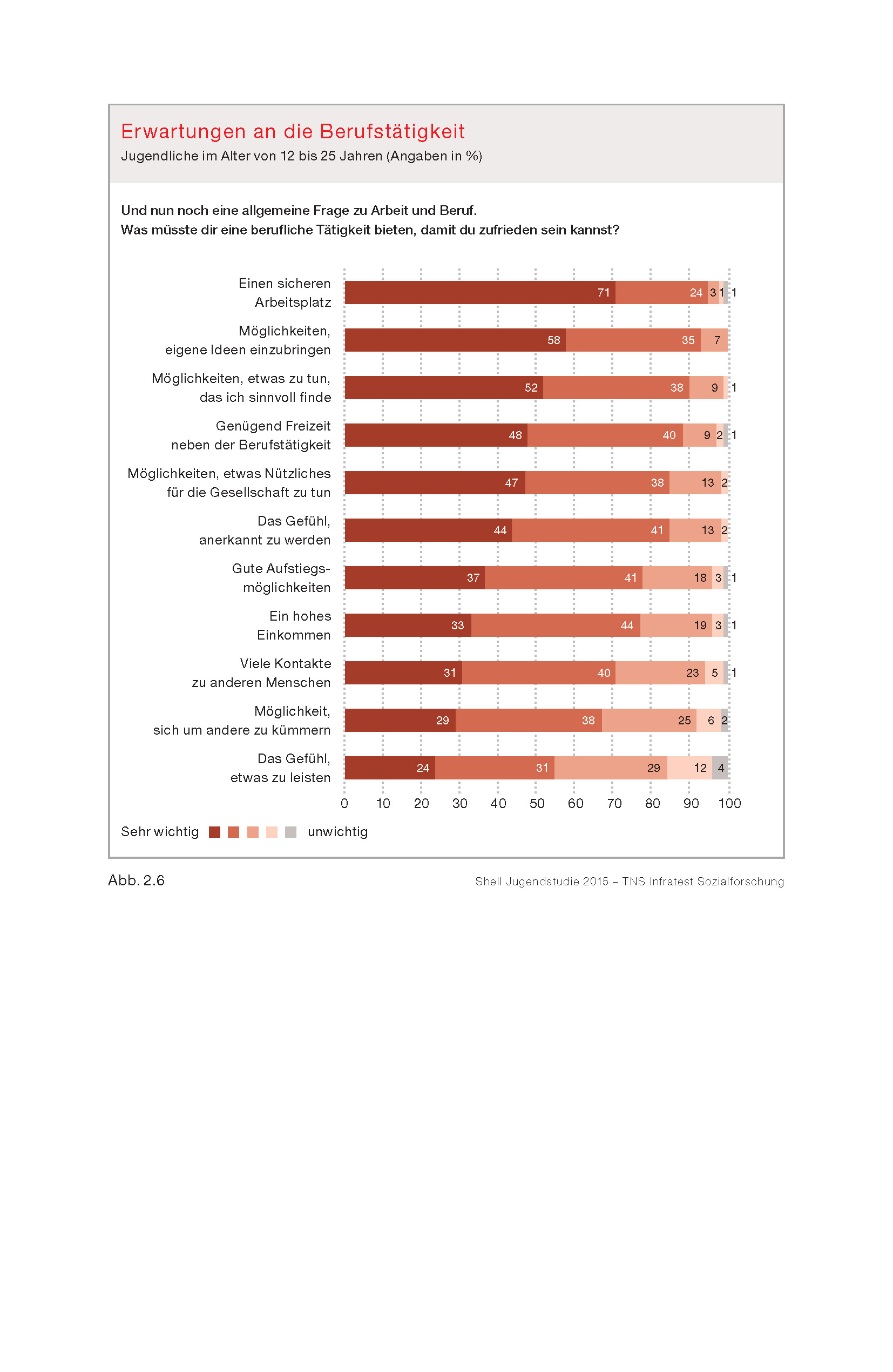 Jugendliche haben heute sowohl hohe Bildungs- und Berufserwartungen als auch hohe Ansprüche an ihre Arbeitgeber. Der Beruf soll interessant sein. Doch zuallererst (für 95 Prozent) ist den Jugendlichen ein sicherer Arbeitsplatz wichtig. Über 90 Prozent meinen, dass Familie und Kinder gegenüber der Arbeit nicht zu kurz kommen dürfen. Für rund vier Fünftel der Jugendlichen ist es wichtig, dass sie ihre Arbeitszeit kurzfristig an ihre Bedürfnisse anpassen können. Drei Viertel möchten in Teilzeit arbeiten können, sobald sie Kinder haben. Karriereorientierung steht hinter der Vereinbarkeit von Arbeit und Privatleben sowie der Planbarkeit von Berufstätigkeit zurück.