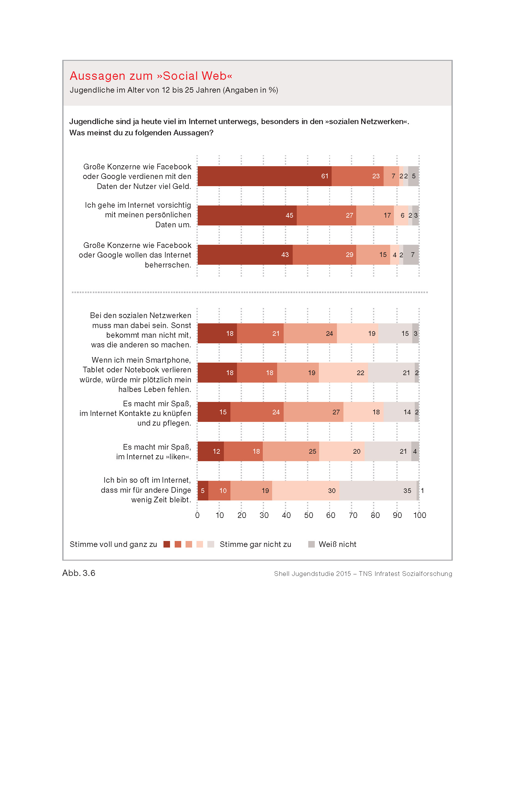 Gleichzeitig sind die Jugendlichen über die Problematik der Datennutzung im Internet informiert und sehen diese auch kritisch. Mehr als vier Fünftel von ihnen glauben, dass große Konzerne wie Google und Facebook mit ihren Nutzern und deren Daten viel Geld verdienen. Obwohl mehr als die Hälfte der Jugendlichen angibt, häufig oder gar sehr häufig Facebook zu nutzen, fällt das Vertrauen in dieses Unternehmen gering aus.