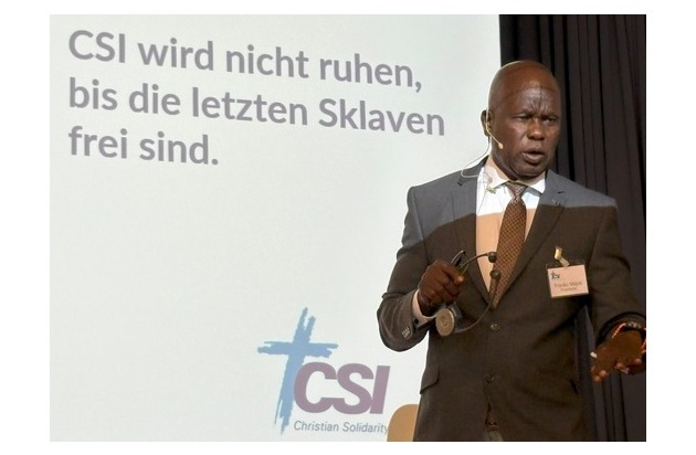 Depuis 2013, Franco Majok est le responsable CSI pour ce programme CSI et coordonne la libération d'esclaves au Soudan et au Soudan du Sud. Lors de la Journée CSI, ce Sud-Soudanais natif a donné aux visiteurs un aperçu du processus actuel de rapatriement et de réintégration des anciens esclaves au Soudan du Sud. " Les personnes libérées n'ont rien. Après des années d'oppression, elles doivent d'abord se réhabituer à la liberté ", a-t-il déclaré. Les anciens esclaves sont chaleureusement accueillis par les communautés villageoises et les Églises du Soudan du Sud et intégrés dans la communauté. De plus, chaque esclave libéré reçoit du sorgho, un " kit de survie " contenant des objets utiles et une chèvre pour l'aider à démarrer une nouvelle vie. Franco Majok entend sans cesse la même phrase dans la bouche des Sud-Soudanais libérés et rapatriés : " Je suis un être humain, je me sens comme nouveau-né ! " Être enfin traité comme un être humain digne et vivre en liberté est un cadeau de Dieu pour les esclaves libérés.