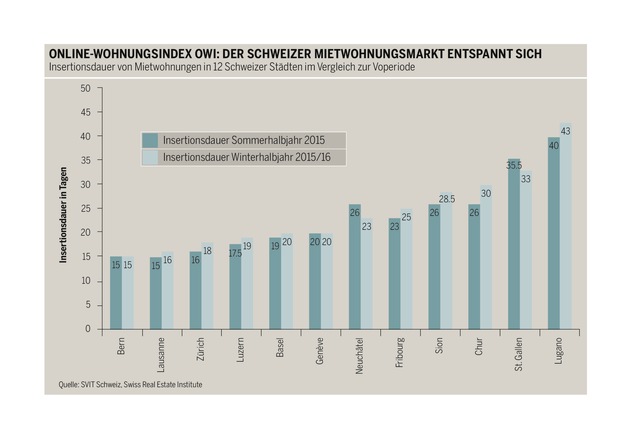 In der ganzen Schweiz sind im Winterhalbjahr (1. Oktober 2015 - 31. März 2016) 123'563 Wohnungen auf Internetplattformen angeboten worden. Das Angebot wuchs gegenüber der Vorperiode um fast 6%. Die durchschnittliche Insertionsdauer einer Wohnung stieg von 27 auf 29 Tage. Die Zunahme der Insertionszeiten wurde damit massgeblich von der Angebotsseite getrieben. Dies zeigt der Online-Wohnungsindex (OWI) der halbjährlich vom Schweizerischen Verband der Immobilienwirtschaft SVIT Schweiz und dem Swiss Real Estate Institute errechnet und publiziert wird. Die Analyse beruht auf allen Mietwohnungen, die auf Schweizer Internetplattformen angeboten werden.