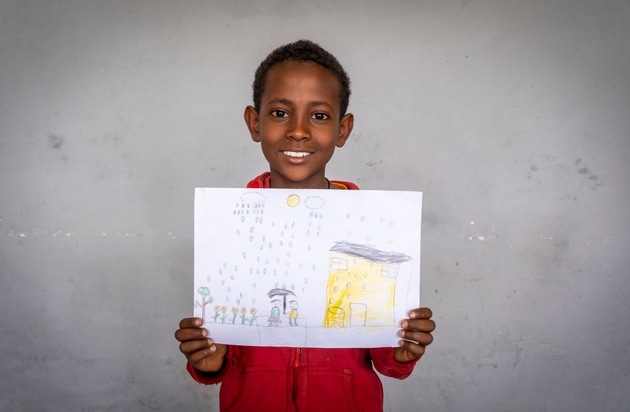 Das zeigt auch das Bild von Yosef Wondewossen, zehn Jahre alt. Er hat sich zusammen mit seiner kleinen Schwester unter einem Schirm gezeichnet, während dicke Regentropfen auf ihr Haus niedergehen. "Das Dach ist voller Löcher. Wenn es regnet, wird alles nass - auch unsere Decken. Dann können wir nicht schlafen", erzählt Yosef.