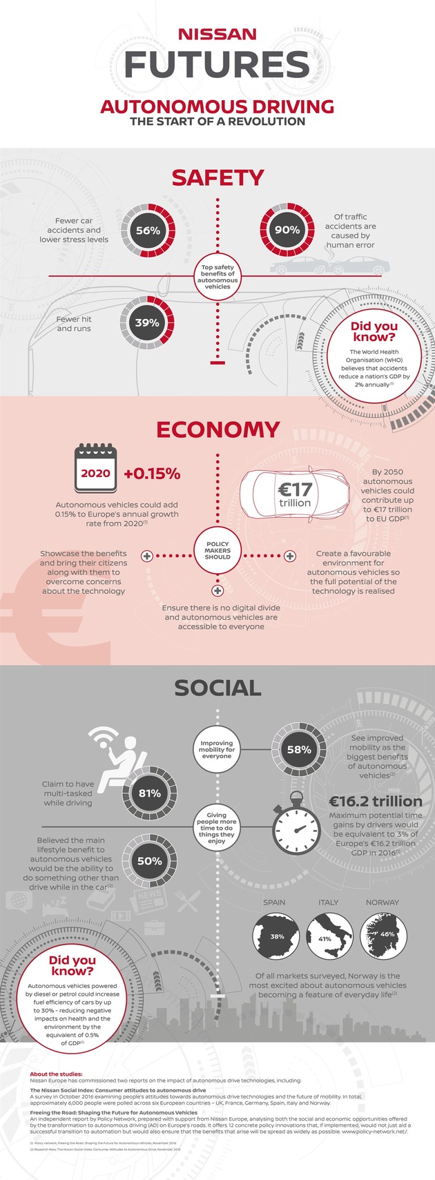 Paul Willcox, Chairman of Nissan Europe, a déclaré : « Ce rapport indépendant prouve que nous sommes au coeur d'une révolution socio-économique qui va bien au-delà du véhicule lui-même. Il montre l'impact fondamental qu'aura la technologie autonome non seulement sur l'industrie automobile, mais également sur l'ensemble des économies et des sociétés européennes. »