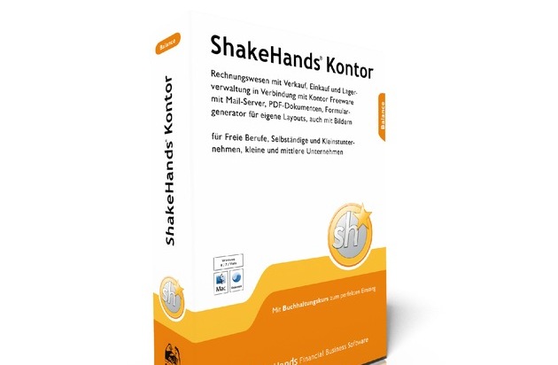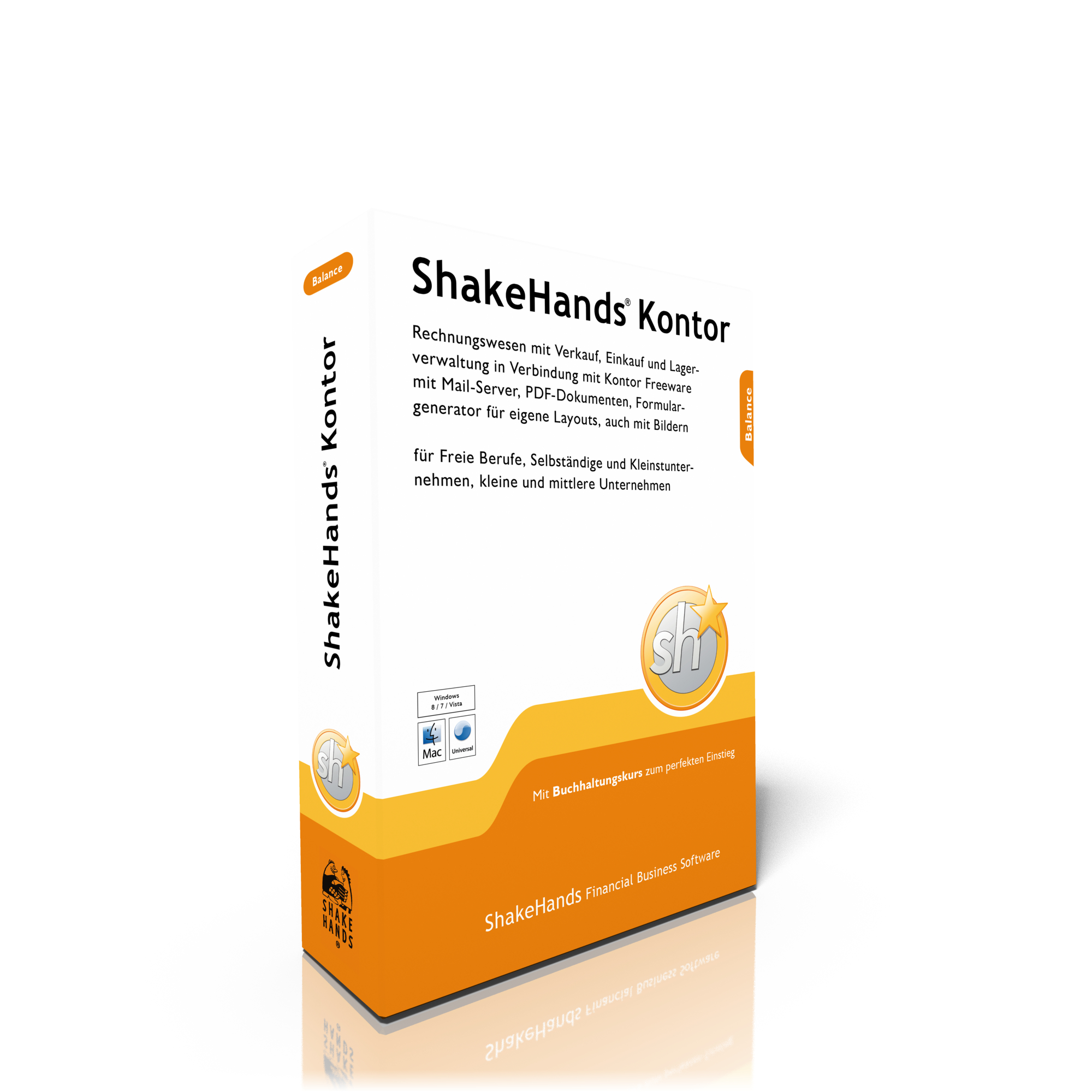 ShakeHands Kontor 2015 das integrierte Bürosoftware-Komplettpaket umfasst die Ausführungen Freeware mit Kassenbuch, Adressen, Offene Posten, Fremdwährungen Shakehands Kontor Saldo mit Buchhaltung, MwSt-Abrechnung mit Jahresabschluss sowie Shakehands Kontor Balance mit Rechnungswesen, Bestellwesen und Warenwirtschaft samt Aboverwaltung, Abschlagsrechnungen, Mail-Client und digitaler Anhänge.