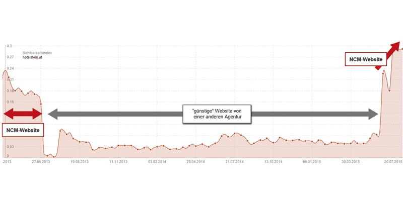 Seit Jänner 2015 gilt die Hotel Amadeus GmbH als neuer Betreiber des legendären Hotel Stein in der Salzburger Altstadt. Zeitgleich mit der Übernahme entschied man sich für einen neuen Internetauftritt: die damals bestehende, kostengünstige, Webseite sollte durch ein neues und zukunftsorientiertes Webseitenmodell ersetzt werden. Mit der ncm.at - Net Communication Management beauftragte die Geschäftsführung der Hotel Amadeus GmbH zweifelsfrei keinen billigen Anbieter für den Webseitenrelaunch. Dass diese Entscheidung richtig war belegt der Sichtbarkeitsindex nach Sistrix. Dieser belegt die Präsenz der Website in den Suchmaschinen .