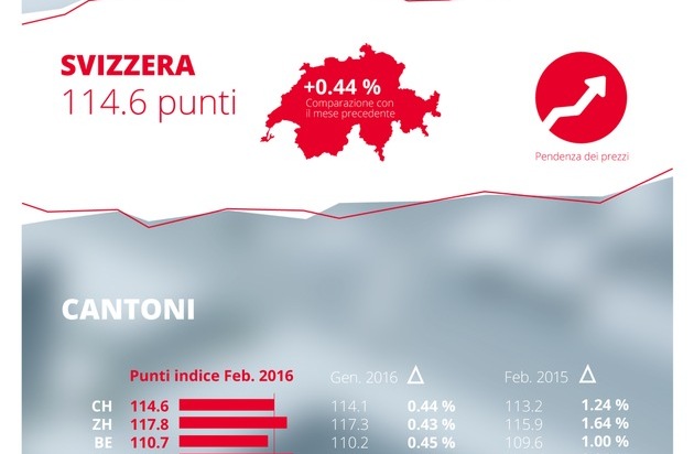 Nel mese di febbraio 2016, i canoni di locazione offerti in Svizzera registrano un aumento dello 0,44 percento. L'indice Svizzera si attesta a 114,6 punti. Rispetto allo stesso mese dello scorso anno, i canoni di locazione sono aumentati dell'1,24 percento. Il Canton Ticino ha fatto registrare una riduzione dello 0,64 percento.