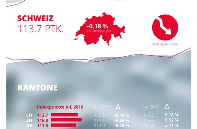 Im Juli 2016 sinken die Angebotsmieten in der Schweiz um 0.18 Prozent. Der Index Schweiz steht bei 113.7 Punkten. Im Vergleich zum Vorjahresmonat steigen die Mieten um 0.18 Prozent. Im Kanton Zürich sinken die Angebotsmieten um 0.26 Prozent.