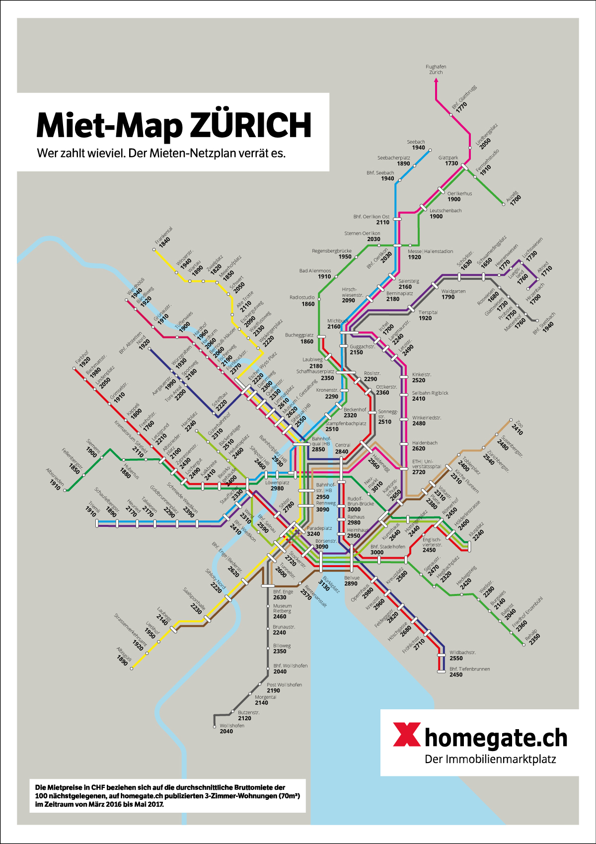 Die Preise sind jeweils in CHF angegeben und beziehen sich auf die durchschnittliche Bruttomiete für eine Drei-Zimmer-Wohnung von 70 Quadratmetern. Als Berechnungsgrundlage wurde der normalisierte Median aus den 100 nächstgelegenen homegate.ch-Objekten im Zeitraum März 2016 bis Mai 2017 verwendet.