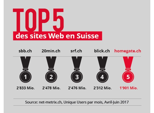 NET-Metrix, l'autorité suisse indépendante pour la recherche sur l'utilisation d'Internet, a récemment publié son étude sur les monnaies en ligne régulièrement publiée pour le deuxième trimestre 2017. Avec 1,9 million d'utilisateurs par mois, homegate.ch se classe pour la première fois parmi les 5 premiers sites Internet les plus visités de Suisse.