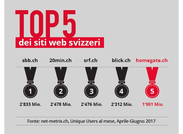 NET-Metrix, l'stanza svizzera indipendente per la ricerca sull'utilizzo di Internet poco tempo fa ha pubblicato il suo sondaggio online sulle valute per il secondo trimestre del 2017. Con 1,9 milioni di utenti ogni mese homegate.ch è entrata per la prima volta nella top 5 dei siti web con il raggio d'azione più ampio in Svizzera.