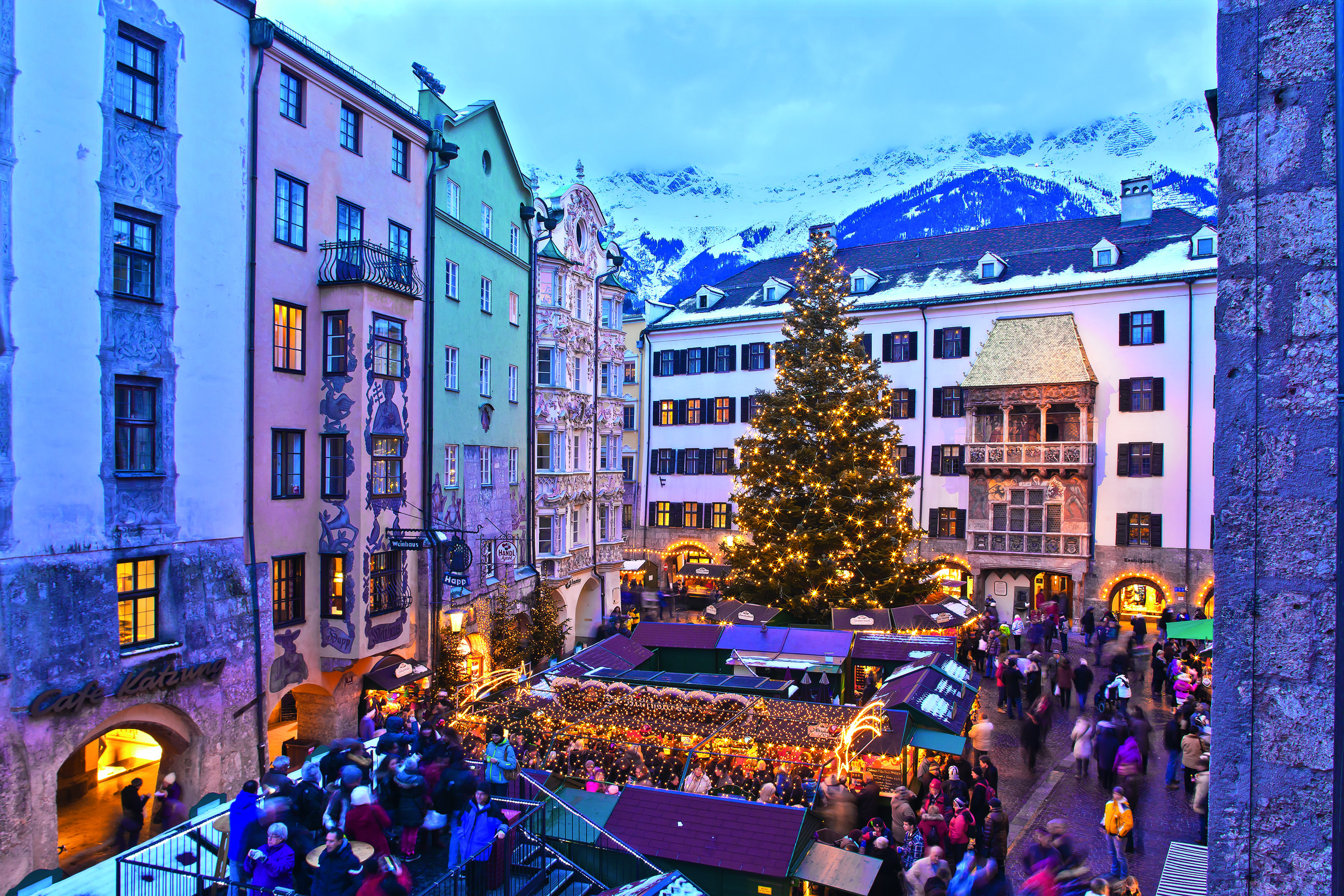 Die Laubengänge der mittelalterlichen Altstadt Innsbrucks säumen einen Christkindlmarkt voller Romantik. Zauberhaft geschmückt sind auch die kleinen Seitengassen, in denen Märchenfiguren Geschichten lebendig werden lassen. Zu den weiteren vorweihnachtlichen Highlights zählt auch der Swarovski-Christbaum am Marktplatz, dessen 170.000 funkelnde Kristalle über dem Kinderparadies mit Kettenkarussell und Streichelzoo strahlen.