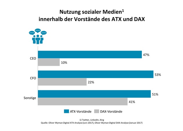 Für die Analyse "Digital ATX" untersuchte Oliver Wyman alle ATX-Vorstände hinsichtlich Präsenz in den sozialen Netzwerken LinkedIn, Twitter und Xing. (Erhebung: Mai 2017; Vergleichzahlen aus dem DAX: Januar 2017)