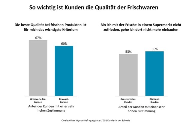 Für die Analyse hat Oliver Wyman im Herbst 2017 über 4'000 Konsumenten befragt, darunter 1'052 in der Schweiz. Abgefragt wurden allgemeines Einkaufsverhalten sowie die Relevanz und Bewertung von Preise, Aktionen sowie der Frischeleistung ausgewählter Detailhändler.